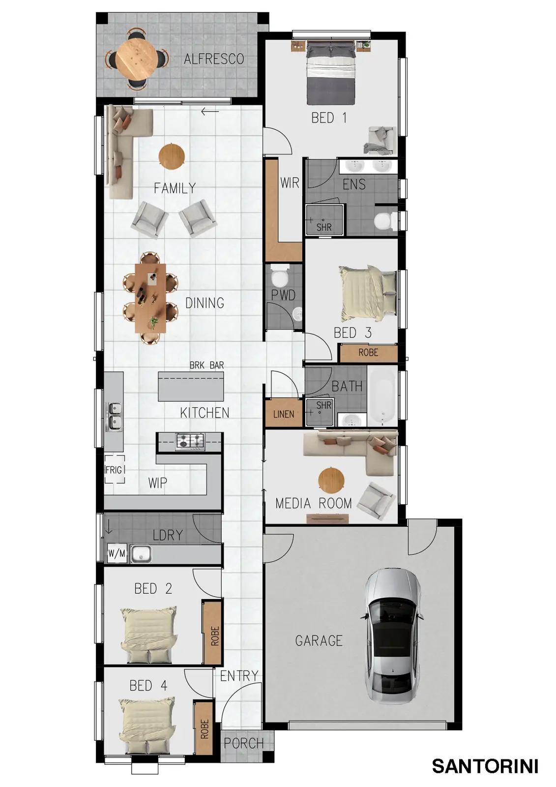 Explore the Santorini – a luxurious family home with designer finishes, spacious floor plans, and tailored façade options by Freedom Homes Queensland Builders in Brisbane.